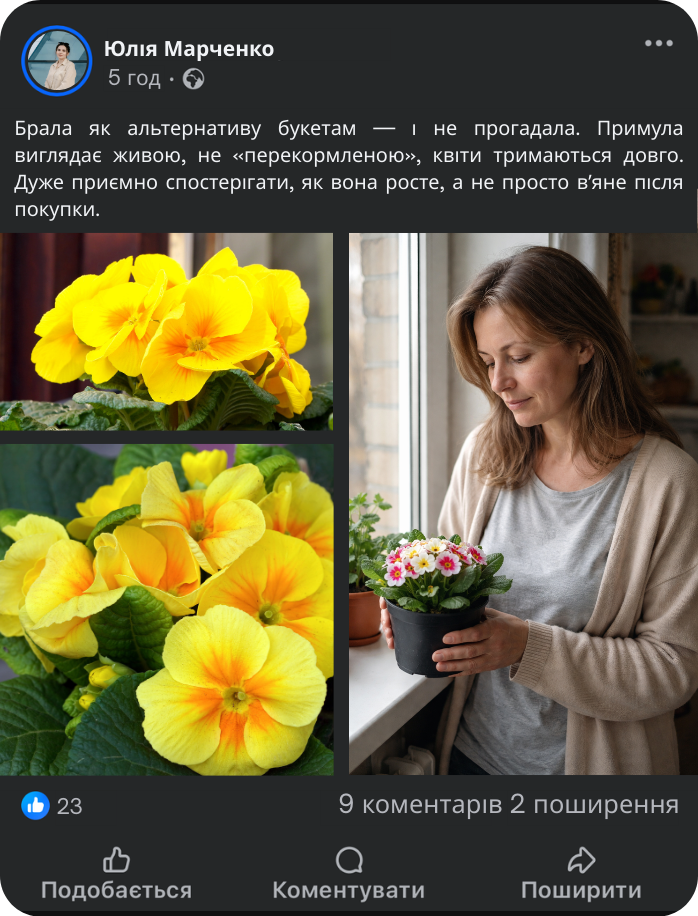 Більшість магазинних квітів виглядають красиво лише в перші дні. Вони вирощені у тимчасовому ґрунті, перекормлені стимуляторами, пережили транспортування і зміну умов. У результаті — рослина швидко слабшає, скидає квіти і часто просто пропадає.