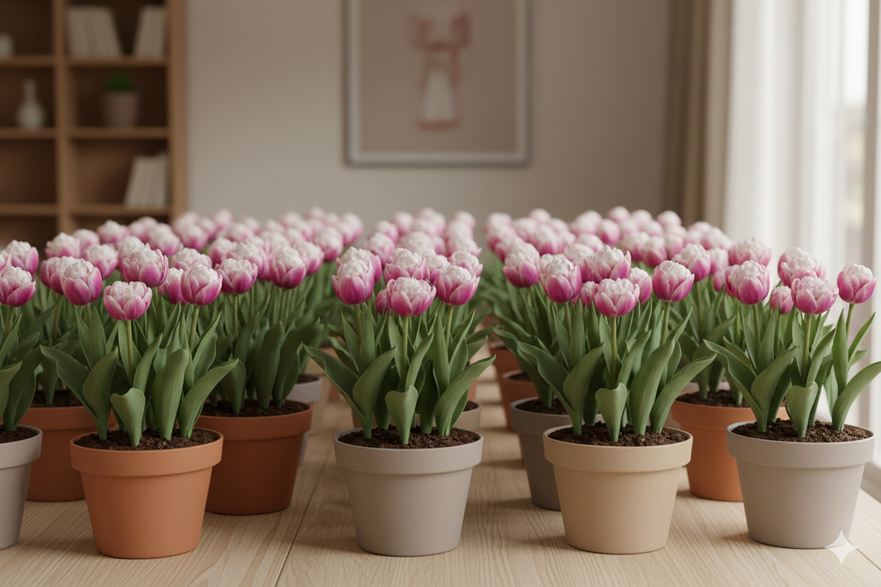 Для успішного вирощування тюльпанів «Ice Cream» у кімнатних умовах оберіть світле місце з м’яким, розсіяним освітленням.